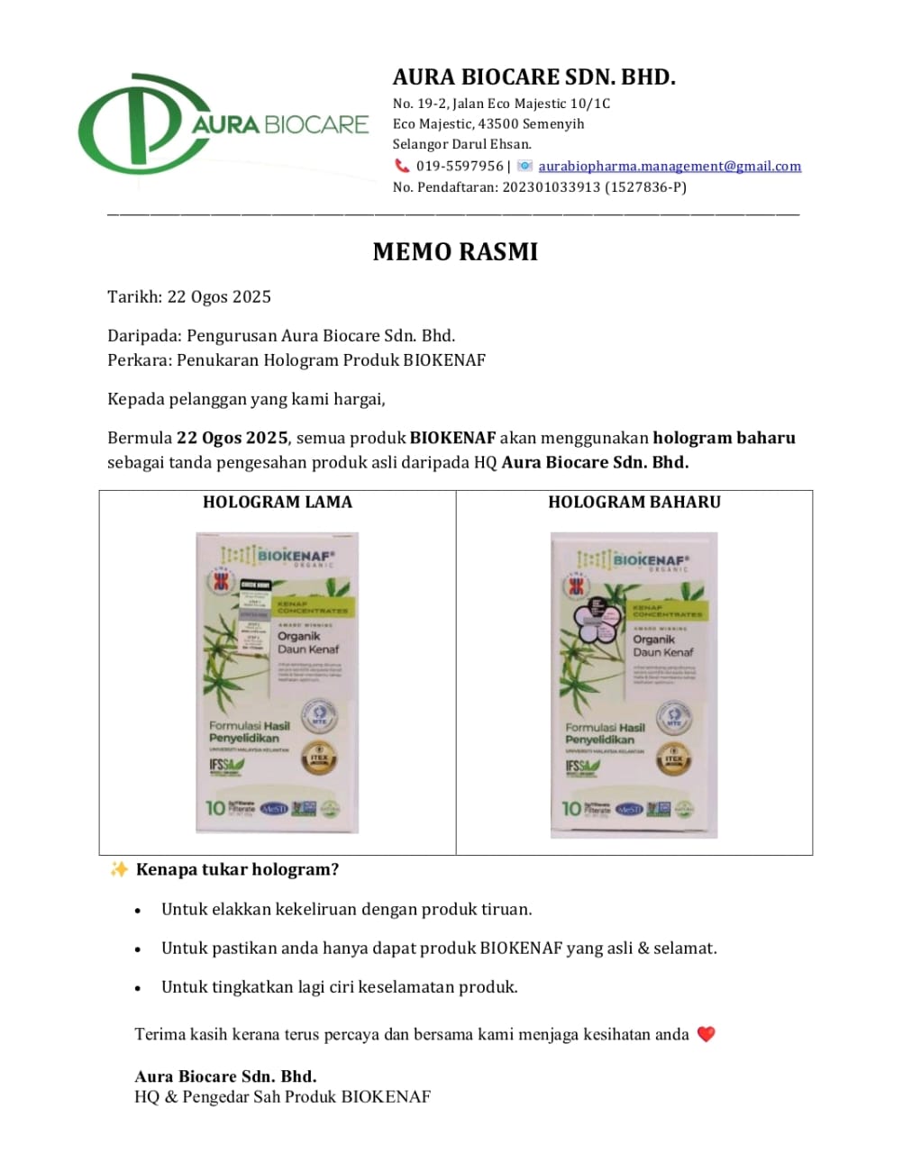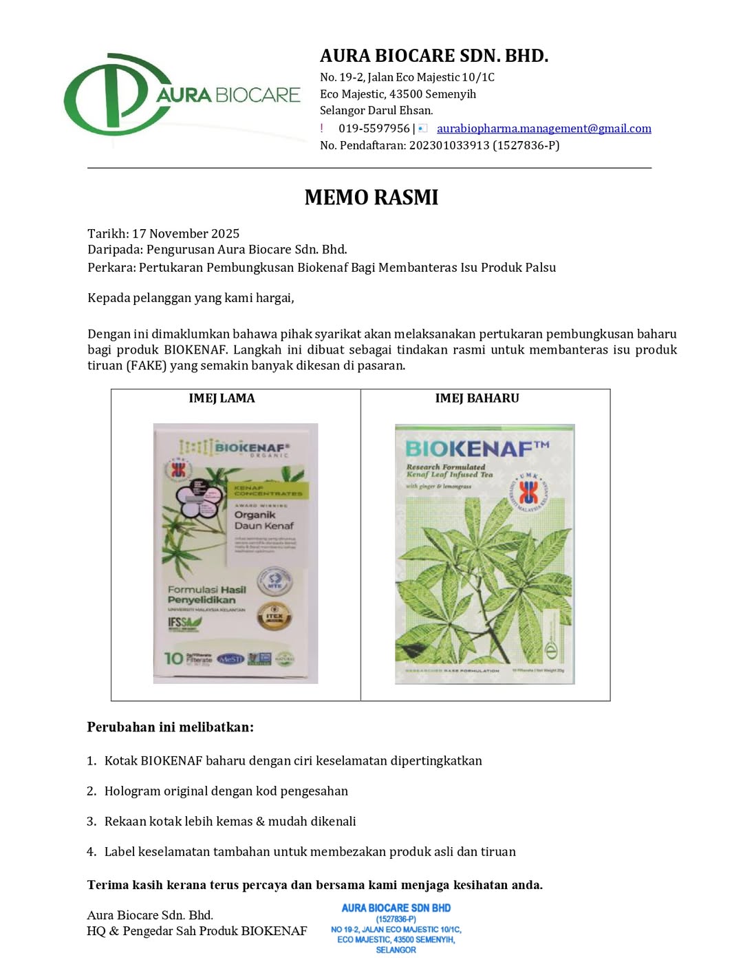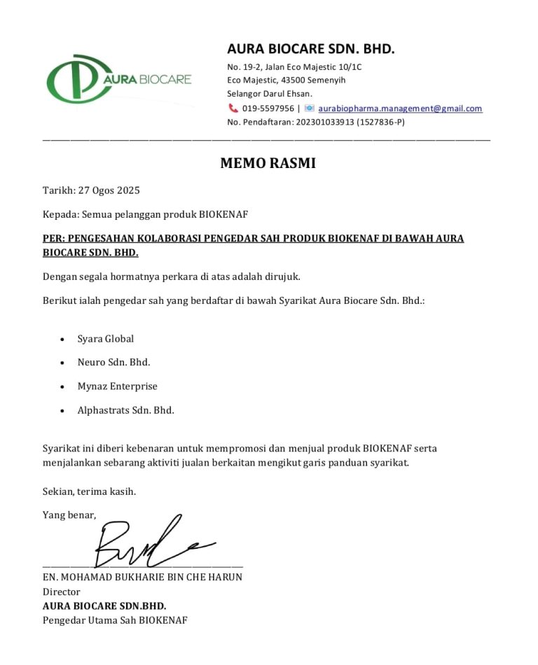 Takut terbeli produk fake? Jangan risau, kami merupakan pengedar sah BIOKENAF iaitu syarikat Syara Global seperti di nyatakan dalam memo di bawah. Jadi, belilah tanpa ragu-ragu di website ini. Di jamin Original. Belilah hanya melalui pengedar sah sahaja.